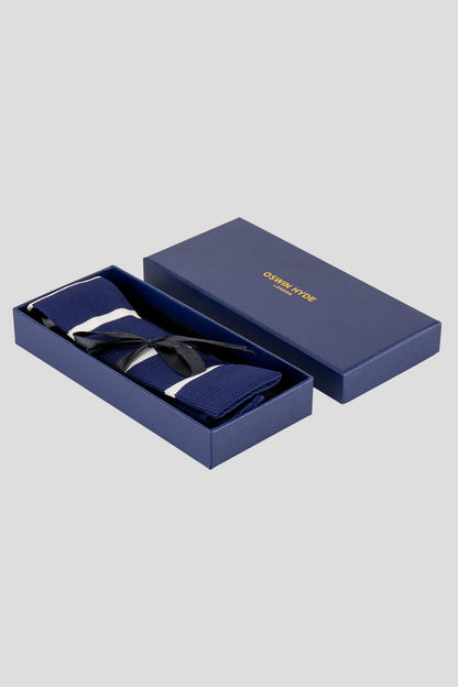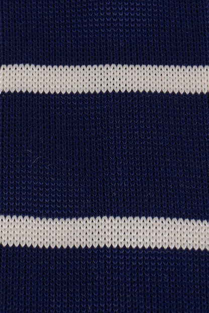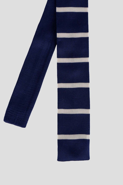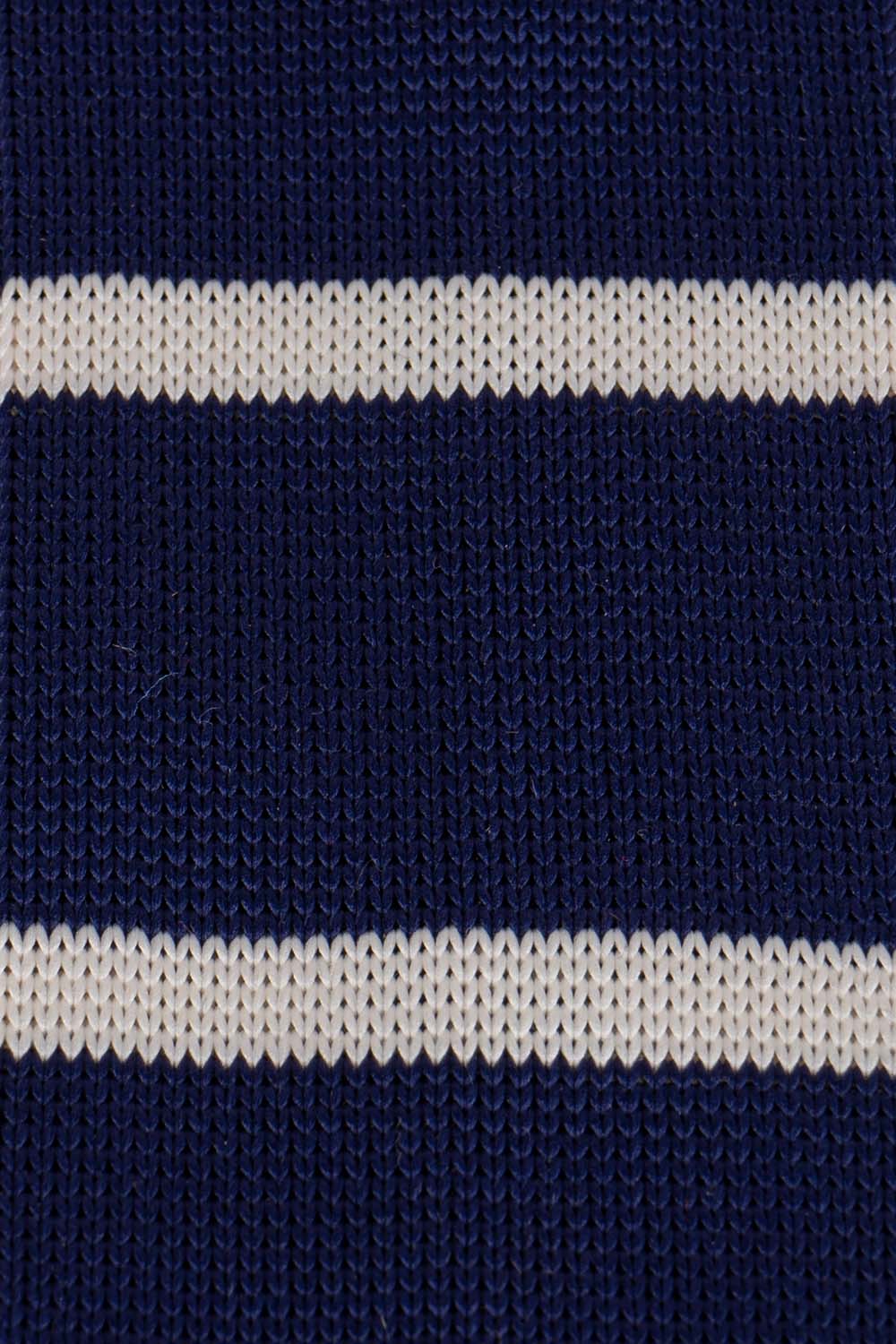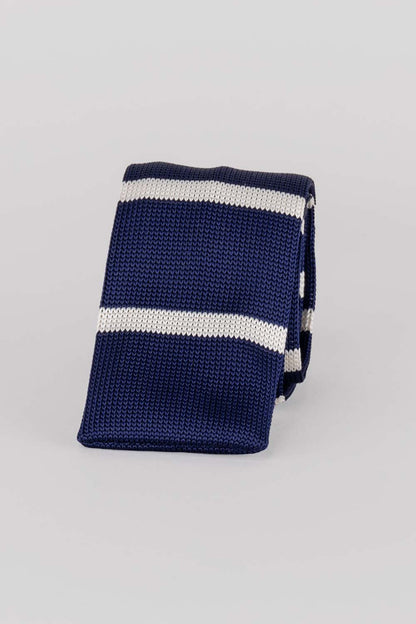 The Drew Navy/White knitted tie offers a sophisticated edge to any outfit – perfect for weddings or evening events. Crafted by hand with luxurious detailing, it features a classic striped design in elegant navy and white hues, and is finished with 6.5cm of width. Its refined style and quality fabric makes it the ideal accessory for any formal occasion.